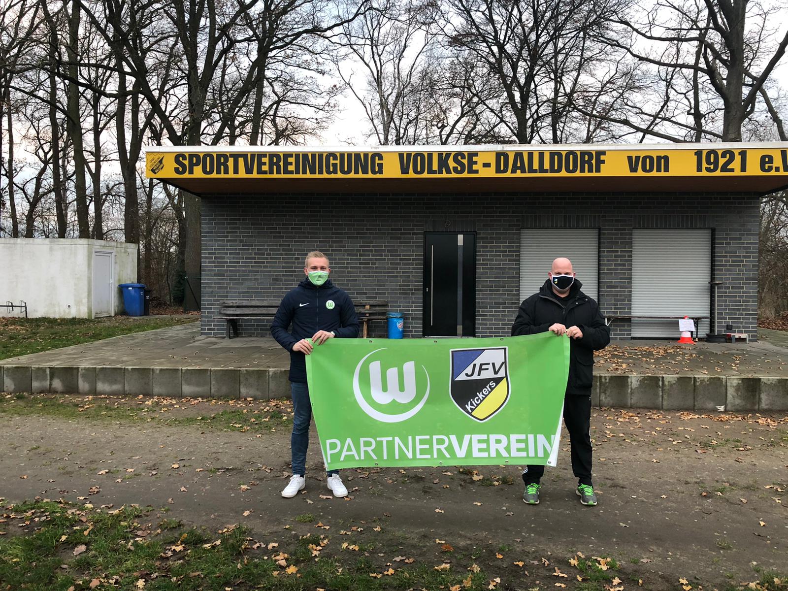 Heute übergab Jonas Garzke vom VfL Wolfsburg das "Anstoß VfL" Partnerverein Banner für den JFV Kickers an Stefan Kalberlah.