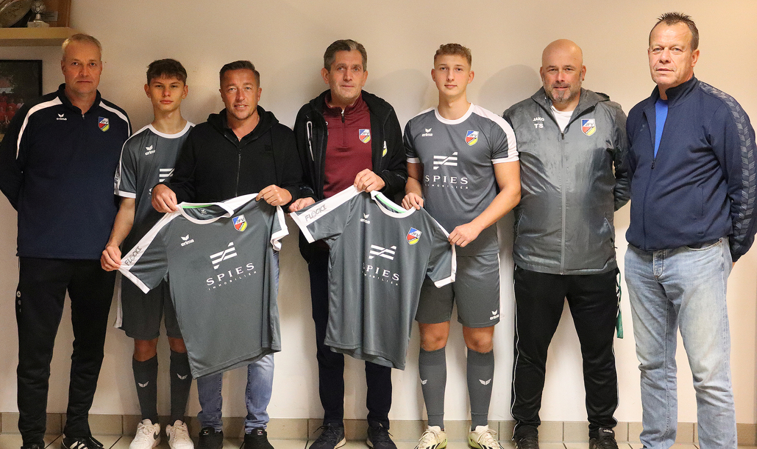 Wir sagen Dankeschön ... Keine Angst, wir stimmen hier jetzt nicht den Party-Schlager der Flippers an. Wir sagen Dankeschön ... und das mal wieder! Dank der Unterstützung von Spies Immobilien (Walerij Spies, 3. von links) und Flocki (rechts Jens Hasenfuß) laufen die A-, B- und C-Junioren-Fußballer des JFV Kickers künftig einheitlich auf.